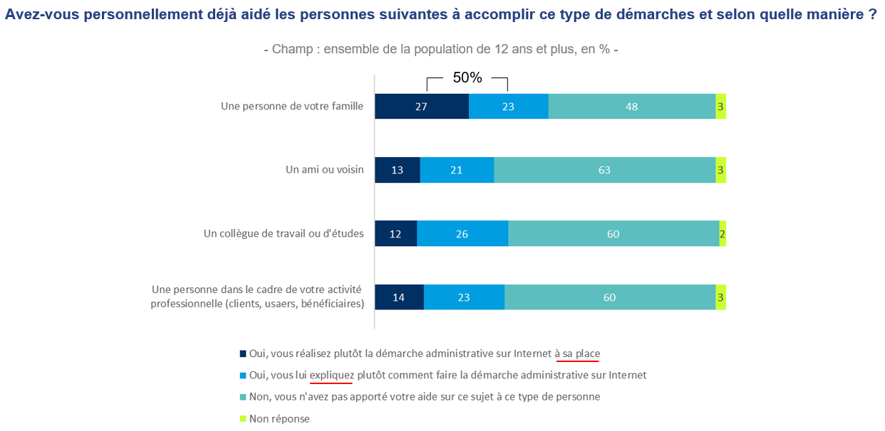 Les personnes les plus fréquemment aidées restent les membres de la famille. 50 % des Français leur apportent une aide sur ce registre, 27 % en réalisant la démarche administrative en ligne à la place d’un proche, et 23 % en ayant expliqué comment la faire.