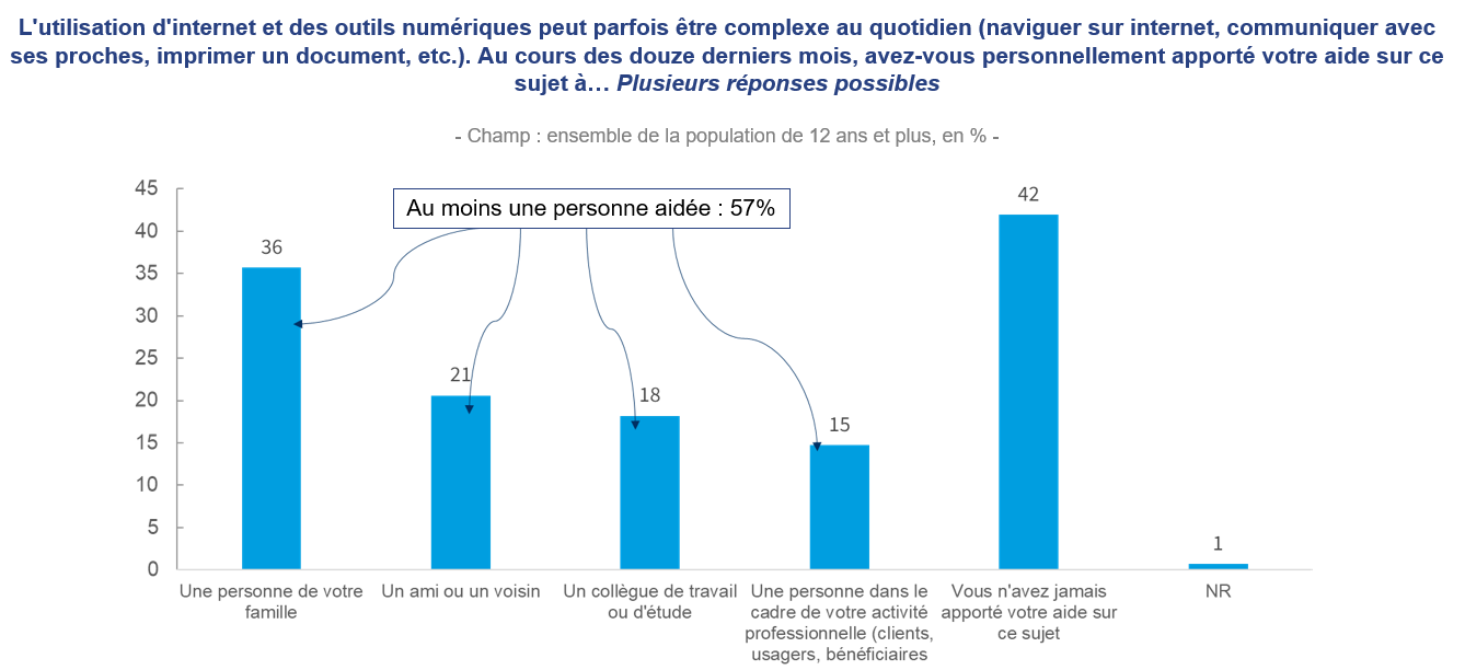 Près de six Français sur dix ont déjà joué un rôle d’aidant numérique (57 %). Cette aide est souvent tournée vers un seul réseau de sociabilité plutôt que diversifiée : 42 % des Français n'aident qu'une seule catégorie de leur entourage, là où 15 % en aident plusieurs. L'aide à la famille est la plus répandue (36 %), suivie de l'aide à un ami ou voisin (21 %), puis de celle à un ou une collègue de travail ou d'études (11 % de la population et 18 % des personnes en emploi ou en études), ou encore à d'autres personnes de la sphère professionnelle comme des clients, des usagers ou des bénéficiaires (9 % de la population et 15 % des personnes en emploi). L’ampleur de la proportion de Français qui aident une personne de leur entourage à utiliser les outils numériques contribue à illustrer le besoin d’accompagnement de la population vers l'appropriation de ces technologies.