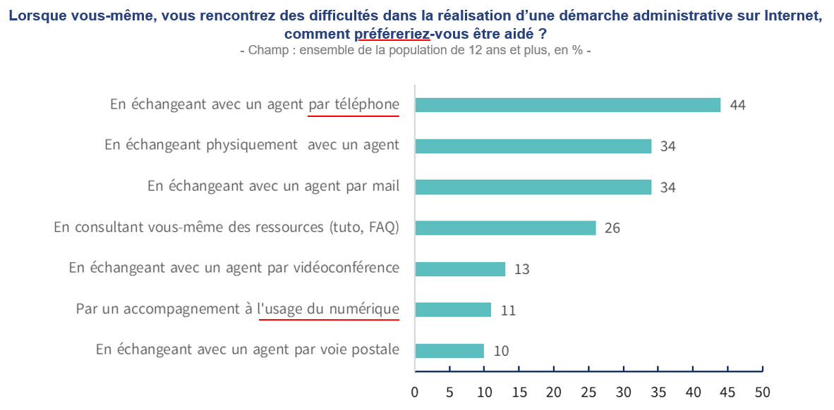 Globalement, le recours à un contact humain est plébiscité par les Français en cas de difficulté dans la réalisation de démarches administratives en ligne[11].